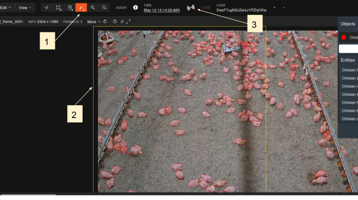 - A yellow box will appear. It shows where the AI is "looking", the area of the image that the auto-segment tool analyses to find objects. Pan and zoom to position the yellow box across the part of the image you want to find features within. Note: To pan, click outside the bounds of the image.
